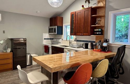 Este será su espacio privado con su propia entrada, separada de la casa principal. Ubicado en un vecindario seguro, tranquilo y verde. Excelente ubicación, restaurantes y tiendas en las cercanías.
