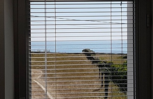 Planta alta: vista al mar desde la habitación grande con 2 camas de 90, se puede unir en 180, sillones, armario, cómoda, televisión, mesa de café; baño