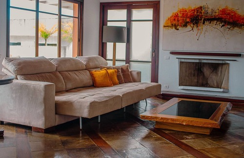 It has three bedrooms, four beds (2 king, 1 double and 1 single cm aux) and two mattresses, three bathrooms and toilets, TV, Air Conditioning (living room, bedrooms and games room), Jacuzzi, Full kitchen, barbecue, swimming pool, parking (four spaces) and WI-FI.