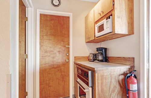 Speaking of dining, the kitchenette back inside offers everything needed to make homemade breakfast, lunch, and dinner while you're here. Enjoy meals together at the cafe table, which also offers great views of the wide sandy shores just west.