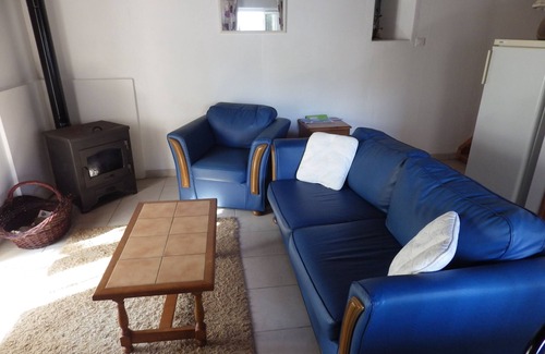 El área abierta de estar de planta con fuego de leña para los meses más fríos, sofá, TV por satélite en Inglés o Francés table y café.