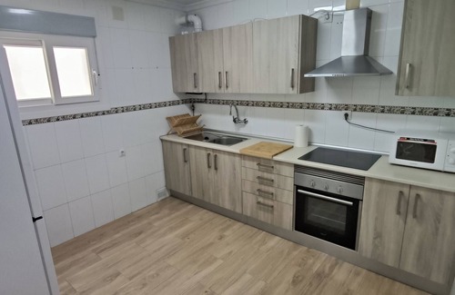 Totalmente equipada con vitrocerámica, microondas, horno y todo el menaje necesario para preparar comidas cómodamente.