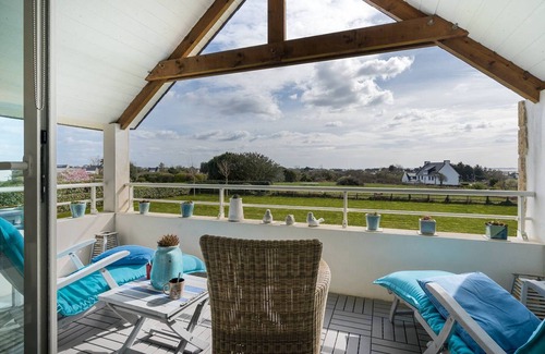 - Sala de estar con zona de estar (sofá, sillones, TV) que da a la logia orientada al sur y ofrece una hermosa vista de la bahía de Plouharnel.