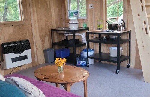 au Canada. Vivez la vie parmi les oiseaux dans la canopée. Construit sur deux pins imposants, ce palais hors réseau durant les 4 saisons est néanmoins bien équipé avec de l'énergie solaire, des toilettes privées, un chauffage au propane, ainsi qu'une cuisine intérieure et extérieure. (Un escalier en colimaçon robuste vous emmènera à 28 pieds jusqu'à votre observatoire privé).