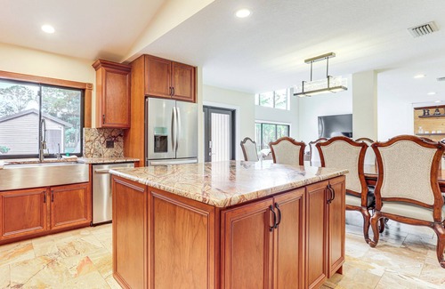 Spend your next Florida getaway in style at this West Palm Beach vacation rental! With an expansive 2-story interior, a private pool, and a serene setting just a short drive from sandy Atlantic beaches, this 4-bedroom, 4-bath house is perfect for a memorable retreat with family or friends. Be sure to tee off at one of the area’s world-renowned golf courses or explore the trails at Riverbend Park.