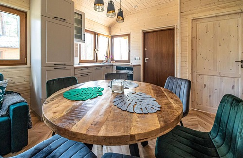Esta encantadora casa de madera con vistas a un idílico lago promete tranquilidad y momentos inolvidables en la naturaleza. Prepara tus platos favoritos en la moderna cocina abierta y disfruta de tus comidas en la rústica mesa de comedor. Después, recuéstate en el mullido sofá y transmite una serie o película emocionante que disfrutará toda la familia.