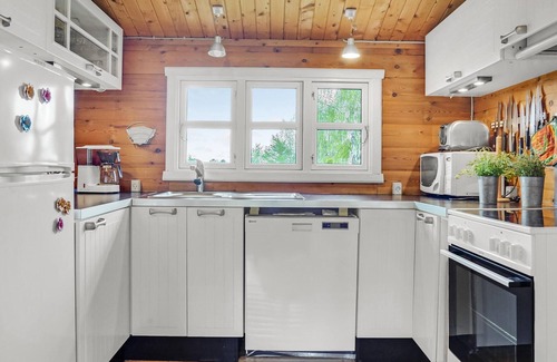 Esta encantadora cabaña de troncos negros con tejado de hierba y acogedoras habitaciones está situada en una tranquila calle de Hornsved, cerca del fiordo y de Kulhuse, e invita a relajarse y relacionarse. El interior de la casa desprende un ambiente cálido gracias a las vigas rústicas y ofrece mucho espacio para una familia pequeña. Ponte cómodo en los sofás, disfruta de una divertida noche de cine y charla hasta altas horas de la madrugada.