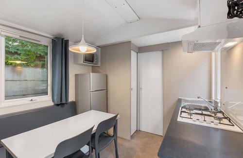 "Florida", 3 estancias mobile home 24 m2. Salón con mesa de comedor. 1 dorm. con 1 cama doble. 1 dorm. con 2 camas y 1 x 1 literas. Cocina (4 fuegos, microondas, congelador, cafetera eléctrica). Ducha, WC separado. Calefacción eléctrica. Terraza. Muebles de terraza. El alojamiento dispone de: Internet (Wifi, gratis). Adecuado para familias. Permitido máximo 1 mascota / perro.