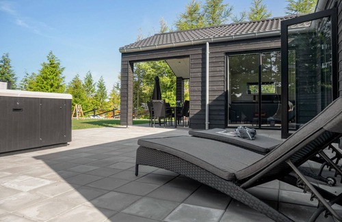 Desde el salón se accede a la terraza, donde podrá tomar el café de la mañana en la parte cubierta mientras los niños juegan en el agua y en el parque infantil privado. Para relajarse, hay una bañera de hidromasaje para masajear sus músculos cansados y una sauna de barril y tumbonas.