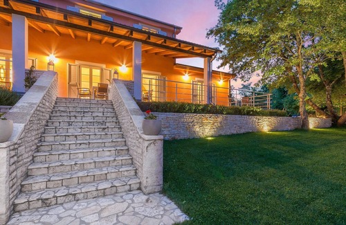 Esta magnífica villa está situada en el tranquilo pueblo de Modrusani, a pocos minutos de Kanfar y no muy lejos de Rovinj. ¡Si usted está buscando una zona tranquila en una ubicación conveniente cerca del centro histórico de Rovinj, esta hermosa villa es la elección perfecta para usted! La villa consta de cinco habitaciones cómodamente amuebladas y todas con baño privado. Las habitaciones están diseñadas conceptualmente y cada una tiene su propio estilo. La villa es muy acogedora. Sus propietarios han viajado mucho y han decorado la casa con muebles, cuadros, alfombras y otros objetos de diferentes países. Tiene aire acondicionado, sauna y una gran cocina totalmente equipada. En el exterior de la villa encontrará una gran piscina y una amplia zona de aparcamiento privado. La villa tiene una superficie habitable de 300 m2 y una gran terraza con zona de comedor al aire libre. Con su gran jardín, comprende más de 4000m2 de terreno. Alrededor de la piscina hay mucho espacio para broncearse. Siempre dejamos lo mejor para el final? Detrás de la villa encontrará un putting green, un campo de golf de 6 hoyos para practicar su putting, donde podrá disfrutar de relajantes tardes con su familia y amigos. En la propiedad también encontrará una jaula de golf donde podrá practicar sus golpes. Hay palos de golf disponibles en la casa. Esta hermosa villa está rodeada por un jardín mediterráneo vallado. Se puede utilizar durante todo el año y está diseñada para ser extremadamente eficiente desde el punto de vista energético. Cuenta con el certificado 'Energy Passive House'. La villa también está equipada con Wi-Fi y TV vía satélite. Idealmente, la villa tiene capacidad para 10 personas. Por cada persona adicional (+2) hay un cargo adicional de 100 euros por persona y semana. * Los huéspedes tienen acceso a un jardín de 4000 m² y a una gran piscina de 12 x 5,5 m, así como a una casa amplia y confortable, que les permite pasar unas agradables vacaciones aunque mantengan la distancia social. La campiña de los alrededores invita a dar largos paseos a pie o en bicicleta por pueblos y viñedos, sin estar lejos del mar.