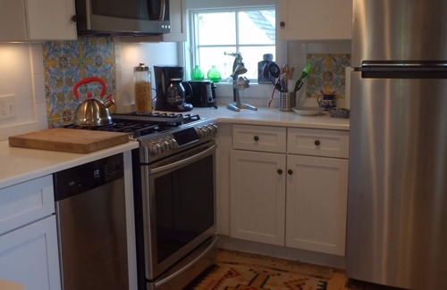 Este apartamento está totalmente equipado con una estufa y gama, microondas, tostadora, cafetera de goteo (hemos dejado los filtros allí) y todos los conceptos básicos para la vida fácil de vacaciones. Hay un montón de vasos y platos, y puedes comer dentro o tomar su cena en el porche y ver los transeúntes. Hay un lavavajillas para que no tenga que perder el tiempo lavando platos.