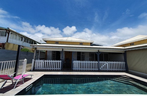 La vista del mar y los Saintes ahora está oculta por los mangos vecinos que han crecido mucho. Pero tendrá acceso detrás de la casa para colgar la ropa y disfrutar de la magnífica vista de la montaña Madeleine y las plantaciones de banano.