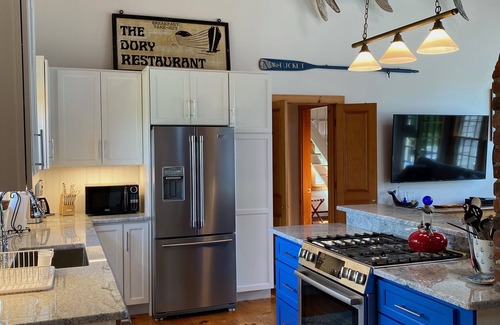 Una escapada maravillosa de vacaciones de verano, esta espaciosa casa es impresionante para las familias que buscan escapar a un rincón especial de Nantucket. Casa puede dormir hasta 8 dependiendo de los arreglos para dormir. 3 habitaciones: espaciosa habitación queen w / TV de pantalla plana y armarios dobles. La habitación doble es ideal para niños con una litera, una cama doble con una cama nido debajo y dos armarios grandes. Ambas habitaciones comparten un baño impecable con tocador y ducha. En el otro lado de la casa, el amplio dormitorio principal tiene una cama king, TV de pantalla plana, vestidor, baño completo en suite y loft de oficina a la terraza al aire libre. La cocina totalmente equipada tiene una barra de desayuno y se abre al comedor con capacidad para 8 personas en la amplia mesa de campo. La sala de estar abierta tiene techos altos, una chimenea de leña y dos áreas de descanso, ambas con vistas a la televisión de pantalla plana y a la cocina. Loft fuera de la sala de estar con escalera de caracol es un excelente lugar de reunión para niños para televisión, juegos. rompecabezas, lectura. Gran terraza al aire libre es perfecta para cenar al aire libre. Gran patio bien cuidado, también!