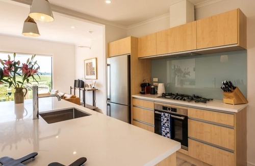 Las villas están diseñadas por arquitectos con accesorios y accesorios de alta gama. ¡La vida relajada pero elegante es el plan! La entrada es a una gran cocina abierta, comedor y sala de estar. Separado de esto, hay una segunda sala de estar / multimedia, con un sofá cama y un televisor con Netflix, por lo que hay espacio para que diferentes grupos disfruten de su propio espacio. La cocina está muy bien equipada con electrodomésticos de alta gama, incluida una cafetera Nespresso, y tiene una despensa. Ambas salas de estar, así como los 2 dormitorios frontales, se abren a una espaciosa terraza, con una gran mesa de comedor al aire libre, así como hermosas y cómodas sillas al aire libre, ¡perfectas para relajarse con una copa de excelente vino de la isla Waiheke! La casa está orientada al noreste, por lo que recibe un sol excelente todo el día.