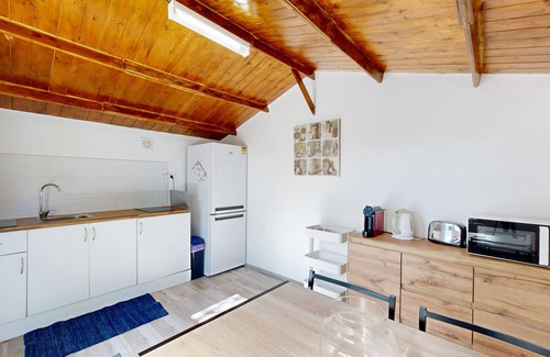 Este alojamiento en particular está dividido en dos estancias, en una se encuentra el dormitorio con cama de matrimonio y cuarto de baño con ducha. En la otra estancia la cocina y zona de comedor interior.