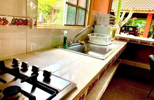 Habitación y dormitorio separadas por una puerta; cuenta con cocineta equipada con utensilios básicos de cocina: estufa, horno microondas, cafetera, refrigerador; cuenta con un aire acondicionado, una tv Smart y wifi