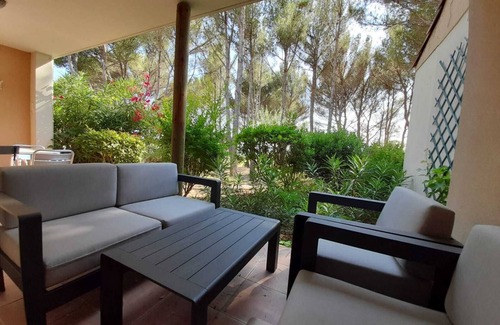 Relájate en la piscina compartida o tómate algo en el porche o patio de esta casa de vacaciones de 50 m². Para cambiar un poco, entra y disfruta del wifi y de la televisión.
