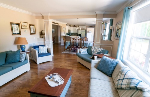 Tenemos una gran sala con dos sofás, un sofá y una silla para disfrutar de la televisión de 55 "o de la radio Boze Wave. Hay un montón de espacio para disfrutar de juegos o para armar rompecabezas con sus seres queridos. La sala de estar / sala de estar está configurada para disfrutar de las hermosas vistas del río, leer o disfrutar de conversaciones tranquilas con su familia y amigos. Hay una mesa plegable en la sala de estar a la que se puede acceder para comer más o armar rompecabezas si eso es lo que te gusta.