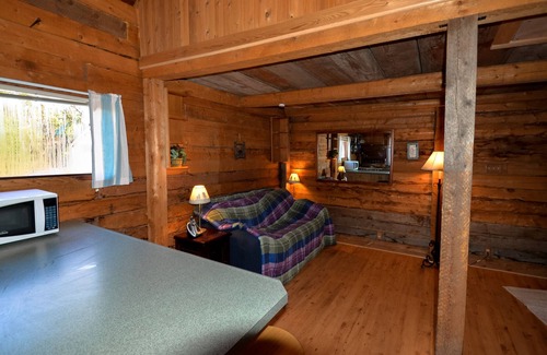 La cabina es un marco pequeño A, con una cocina completa, que incluye agua caliente, un altillo con una cama king size y un sofá cama con una cama full size (está bien para niños, no es cómodo para adultos). También hay espacio para cunas, o un colchón de aire en el piso de las escaleras. Se puede acceder al loft a través de una escalera desplegable, por lo que debe poder subir una escalera de manera segura para usarla. La cabina se calienta con una estufa de leña.