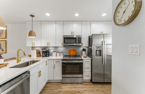 Cuando ingresa al condominio, lo recibe una cocina equipada con todo lo que necesita para cocinar. La cocina está completa con una máquina de hielo, una cafetera (Nueva para 2018: cafetera combinada que preparará una olla, una taza o un estilo keurig), batidora manual, licuadora, olla eléctrica, sartén eléctrica, mezcla de intestinos, recipientes de almacenamiento y una variedad De ollas, sartenes y especias. Disfrute de las impresionantes vistas del agua desde la cocina, el comedor y la sala de estar del nivel principal. Un medio baño se encuentra en el piso principal para su comodidad.
