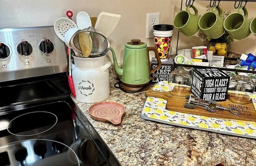 Este alojamiento de 1 dormitorio y 1 baño cuenta con una zona para barbacoas, aire acondicionado y dispensador de agua. El cuarto de baño incluye un secador de pelo, toallas y papel higiénico. La cocina está equipada con horno, placa de cocina y frigorífico, además de cafetera y tetera, hervidor eléctrico y máquina de hielo. Y no tendrás que llevarte ropa de más, porque podrás aprovechar la lavadora y la secadora.