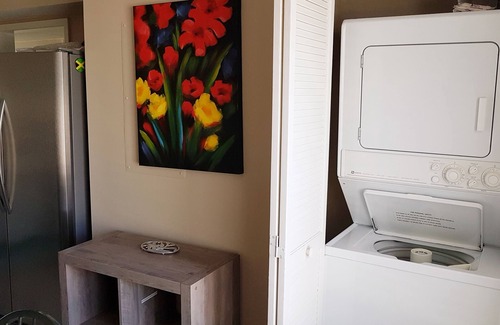 Este condominio de 1 dormitorio decorado con buen gusto viene completo con ropa de cama. Cuenta con un amplio dormitorio con cama tamaño queen y mucho espacio de guardarropas para guardar sus pertenencias. La sala de estar llena de sol tiene un cómodo sofá desplegable tamaño queen y acogedoras sillas. Una práctica puerta de bolsillo proporciona privacidad entre las habitaciones. TV tiene más de 30 canales con wifi.