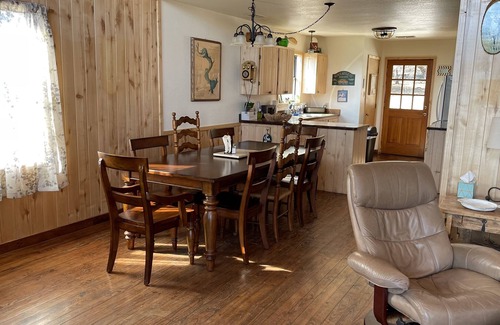 Esta casa puede dormir fácilmente 8 adultos. La pared de ventanas en la sala de estar le permite nunca perder un minuto disfrutando del paisaje. ¡La espaciosa cocina, la estufa de leña, los acabados de madera de álamo temblón, el granero con mesa de ping pong, el columpio de llantas y muchas actividades al aire libre para nuestros huéspedes son solo una breve lista de razones por las que este se convertirá en su lugar de vacaciones favorito! La propiedad es de aproximadamente 3 1/2 acres, lo que le permite extenderse y disfrutar.