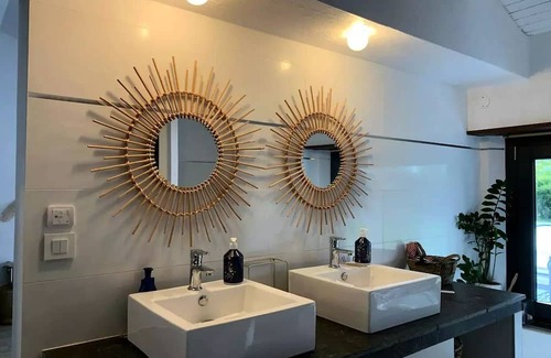 The villa also has a large master suite (1 BED 1.80) with its own bathroom including a bathtub and a shower, with a view of the jacuzzi and the swimming pool