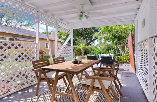 Esta vivienda moderna de la planta baja está escondida en un patio tropical lleno de palmeras exclusivas de Florida y exuberante vegetación. Cuando llegue, se encontrará en el patio delantero que cuenta con cómodos asientos y una mesa de comedor al aire libre a la sombra. Este es el lugar perfecto para disfrutar del hermoso clima de Florida durante el día y la noche.