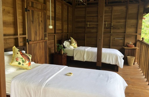 Se alojará en el último piso de la cabaña de madera de teca de cubierta abierta recientemente construida de 400m2 para darle la bienvenida a usted, a sus amigos y a su familia. Todos los muebles de madera han sido hechos por artesanos locales, la ropa de cama es excelente y está hecha de caucho natural local, y todo el equipo es de calidad superior.