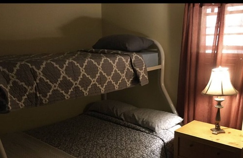 El alquiler es la parte de abajo separada de una casa de campo de río. Tiene sus propias entradas privadas, porches, etc. Hay dos dormitorios, uno que tiene una cama tamaño pillowtop queen y el otro tiene una litera con un colchón de tamaño completo en la parte inferior y un gemelo en la parte superior. Hay un futón en la sala de estar donde pueden dormir cómodamente dos personas más pequeñas o una persona. Colchones de aire están disponibles si es necesario para más de 6 personas. La cocina es espaciosa y tiene mucho espacio para preparar y cocinar la mayoría de las comidas de cualquier tamaño.