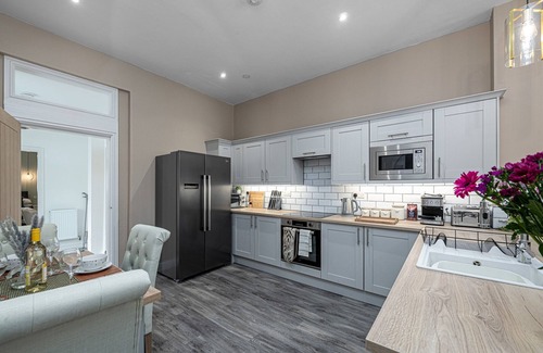 Elegante y contemporáneo, Sea View Retreat en Pwllheli ofrece una espaciosa casa de vacaciones con capacidad para 15 huéspedes, perfecta para familias y amigos que buscan una escapada relajante junto al mar. Ubicada a solo 500 metros de las playas con Bandera Azul, esta moderna propiedad cuenta con dos apartamentos distribuidos en cuatro plantas. La planta baja tiene capacidad para cuatro personas con cocina y sala de estar de planta abierta, dos dormitorios dobles y un baño familiar. El apartamento del primer piso tiene capacidad para 11 huéspedes y cuenta con un amplio salón que incluye chimenea eléctrica, Smart TV con Sky y WiFi. La cocina totalmente equipada cuenta con horno eléctrico, placa de inducción, microondas, cafetera, nevera, congelador, lavavajillas y lavadora/secadora, lo que hace que el alojamiento independiente sea conveniente. Recientemente renovada pensando en la comodidad, la casa incluye una sala de juegos con mesa de billar y juegos de mesa para todas las edades. Las puertas conducen desde la sala de juegos a una terraza con bañera de hidromasaje, perfecta para relajarse al atardecer. El primer piso tiene tres habitaciones dobles (dos con baño en suite), una habitación individual y un baño familiar, mientras que los niveles superiores cuentan con dos habitaciones dobles adicionales con baño con ducha. Hay estacionamiento privado fuera de la carretera disponible en la parte trasera de la propiedad, aunque el acceso a los pisos superiores se realiza a través de escaleras, ya que los apartamentos abarcan cuatro niveles. Explore el animado centro de la ciudad de Pwllheli, lleno de pubs, cafeterías, tiendas y restaurantes locales que sirven especialidades galesas, como el galardonado pescado con patatas fritas. La ciudad es una base ideal para explorar la bahía de Cardigan y el mar de Irlanda, con oportunidades para realizar cruceros costeros para ver focas, aves marinas y delfines. Ya sea relajándose en el jacuzzi, paseando por la playa o descubriendo el paisaje local, Sea View Retreat ofrece una elegante escapada costera para unas vacaciones inolvidables.