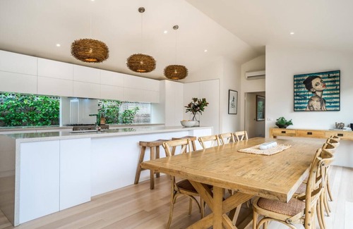 Una característica maravillosa de esta propiedad es la cubierta exterior grande, elevada y aislada. Esta es casi la primera área que lo recibe cuando llega a la propiedad. Desde la cochera, hay una puerta que te lleva a unas pocas escaleras, a la cubierta y a la puerta principal. La cubierta se extiende casi a lo largo de la casa desde la puerta principal, pasando por el área de la cocina / comedor hasta la parte posterior de la sala de estar. Desde allí, otra serie de escaleras lo llevará de vuelta al patio trasero, donde encontrará una hermosa ducha al aire libre. El lugar perfecto para desollar después de un día en la playa. La cubierta en sí está rodeada por árboles y arbustos en dos lados y una pantalla de madera en el tercer lado. La casa se abre al exterior con sus puertas plegables desde el comedor y la sala de estar. En la cubierta hay un gran salón al aire libre con macetas de hierbas frescas y una enorme mesa de café de madera. ¡Trae los mordiscos! Aproveche al máximo la comida en esta increíble región vinícola y pruebe los sabores locales. Hay suficiente espacio aquí para extender una magnífica tabla de charcutería o una tabla de quesos para morirse y una copa o dos de su vino favorito de la península de Mornington. Por supuesto, también hay una barbacoa, si tiene suficiente apetito para una verdadera cena.