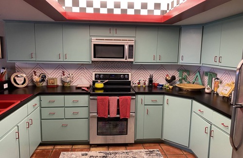 Esta casa de 3000 pies cuadrados está completamente amueblada, con un interior de estilo vintage y una sala de estar con un plano de planta abierto y un área de cocina y bar de estilo retro.