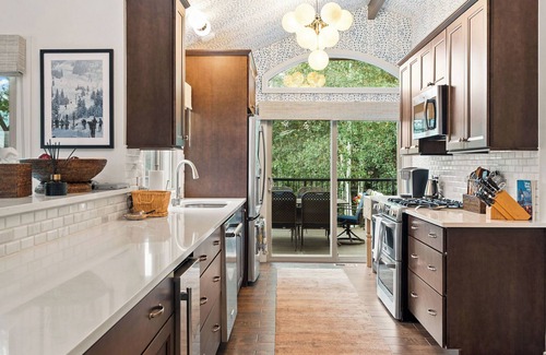 Full service comforts: luxury linens, well-equipped kitchens, abundant parking, high-end bathrooms, and privacy for all guests