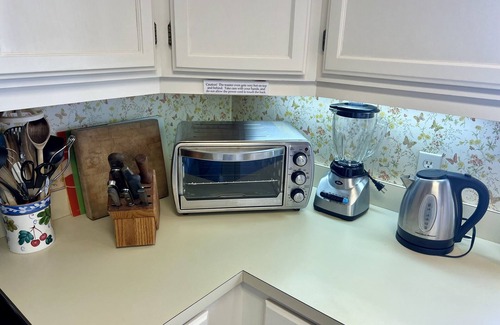 La cocina completa incluye: lavaplatos, cafetera y molinillo, licuadora, microondas, tostadora, horno tostador, remodelada en 1985 por nuestra abuela Pat en su gusto y estilo.