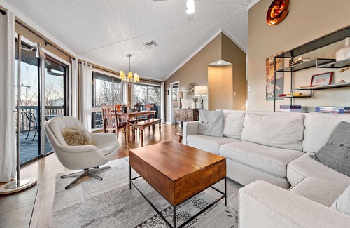 Venga a disfrutar de la vista expansiva y la privacidad de Hanging Round. Esta es una casa de 3 niveles con 3 dormitorios y 3. 5 baños y tres salas de estar separadas que ofrecen múltiples actividades. La planta principal tiene un dormitorio principal con cama king y baño completo, cocina, mesa de comedor con capacidad para 8 y una gran terraza. El nivel medio tiene una sala con registros de gas, 2 dormitorios; uno con una cama queen y baño completo. El segundo dormitorio tiene una cama queen con baño hall. El nivel inferior tiene una sala y baño completo. Se accede a los pisos inferiores por una escalera de caracol o escaleras exteriores. Hanging Round tiene dos cubiertas con mesas de comedor y cómodos asientos para relajarse y disfrutar de la vista. Para todas las comodidades modernas del hogar, ofrecemos televisores de plasma con DVR, internet inalámbrico, lavaplatos y aire central. Para su conveniencia, SE PROPORCIONAN HOJAS Y TOALLAS. Fácil acceso al piso superior desde el área de estacionamiento de automóviles 2-3.