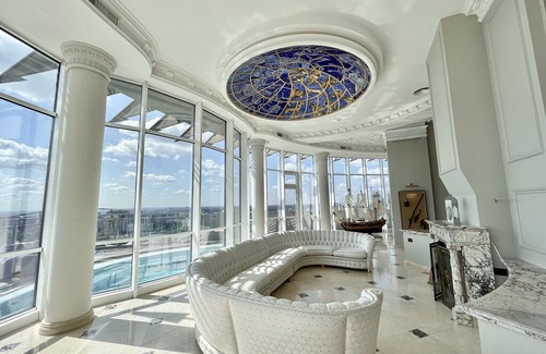 This luxurious bi-level penthouse with a unique interior design is located in the historic center of Kiev, within walking distance from the main square. On the 1st floor you can spend time with your friends near the fireplace enjoying the circular view of the city or watch your favorite movie in your private theater. In the evening you can swim in the warm water pool where no one will see you. In the beautiful and stately wood-finished cabinet you will be able to hold a business meeting with your partners in the warmth of the dim light with a bottle of red wine. On the second floor are four bedrooms with beautiful city views and expensive fittings. This apartment is well worth the effort to plan a trip with family or friends.