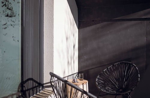 El hermoso balcón invita a salir al exterior, y nuestros huéspedes también pueden utilizar gratuitamente el pequeño patio privado con jardín de hierbas y salón al aire libre.