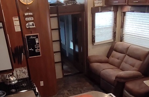 40 foot toy hauler, 2 bedrooms Queen bed in master room, bunk beds in lower room, there is a loft that can sleep 2. Recliners lay out to a bed. Sleeps 8 comfortably. Gas/ Charcoal with oven pit. Firepit with seating area. Has outdoor dinning area on the deck with a bar and outdoor refrigerator. Minutes from Marble Falls and Lake Travis.