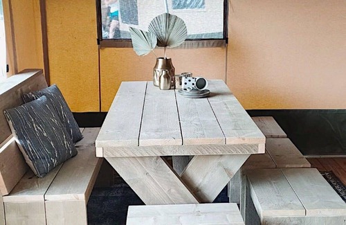 "Safaritent 6", 1-room cottage 50 m2. Simple furnishings: living/sleeping room with 2 x 2 bunk beds, 1 double bed, dining table and flat screen. Exit to the terrace. Small kitchen (4 induction hot plates, kettle, microwave, electric coffee machine). Shower/WC. No heating option. Terrace. Terrace furniture. Facilities: Internet (WiFi, free). Please note: non-smokers only. This object is a glamping tent and can be entered via a few steps. A shared hot tub can be used on the field near the glamping tent. Pets on request.