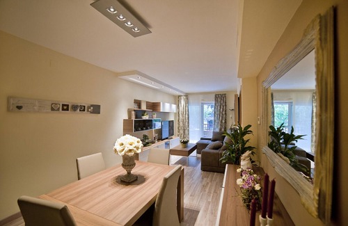 Gracias a sus grandes ventanales, el apartamento recibe luz natural en todas las habitaciones y principalmente en el salón, en donde también se hayan una mesa comedor para 8 personas y una gran TV de pantalla plana. El balcón exterior ofrece una vista de la tranquila vida de barrio.
