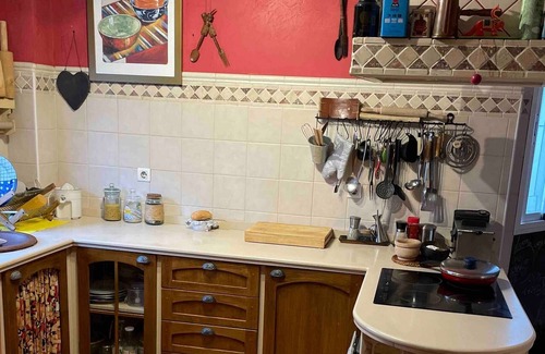 Es en el primer piso de la casa cocina para compartir el uso de la cocina en solo para 2 habitaciones. Cocina full amueblada.