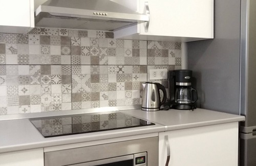 La cocina americana, de inducción, está equipada con nevera, microondas, horno, congelador, vajilla/cubertería, utensilios/cocina, cafetera y hervidor de agua.