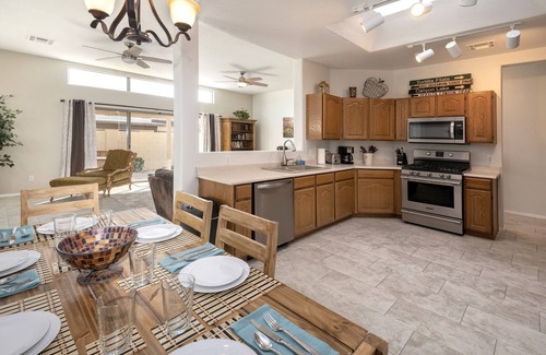 La casa tiene todo lo que necesitas: solo preséntate con tu maleta de artículos personales. La cocina está muy equipada con muchos platos, cubiertos y utensilios de cocina. No tengas miedo de quedarte y cocinar una noche en casa. También hay una parrilla de tamaño completo en el patio junto con 2 mesas con capacidad para un total de 8, si desea disfrutar del hermoso clima cálido de Arizona.