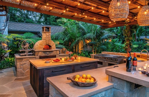 La piscina azul profundo con carril de regazo, spa para 10 personas incorporado y el estante de Baja son el punto focal de los terrenos. Un conveniente Pool House tiene un baño completo y vestidor, junto con una lavadora y secadora para lavar toallas de playa y trajes de baño. Como toque final al aire libre, un televisor de pantalla plana de 50 "está montado sobre la chimenea de leña al aire libre.