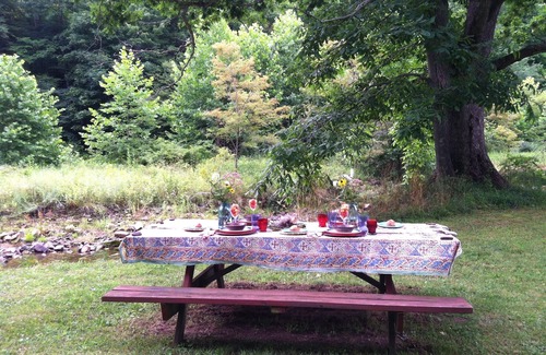 La cabina decorada con buen gusto incluye un dormitorio principal con cama queen, un segundo dormitorio con dos camas individuales, un baño con lavandería, una cocina totalmente equipada, sala de estar / comedor abierta con estufa de leña acogedora, un porche cubierto y una terraza con bañera de hidromasaje y Comedor exterior con parrilla de gas. En Cabin on Back Creek, puedes disfrutar de las estrellas que iluminan el cielo nocturno, observar aves, caminar o simplemente relajarte con un libro en la hamaca, en el porche o en la terraza. A principios de la primavera, hacemos jarabe de arce en la casa de azúcar ubicada junto a la cabaña. Estás invitado a mirar (¡y oler!) el proceso de convertir 40 galones de agua azucarada en un galón de jarabe de arce puro, ¡o puede ayudarnos si lo desea!