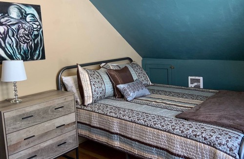 Top floor bungalow in New Tacoma. The living room is bathed in lovely afternoon light. Sleep soundly on your memory foam queen in your bedroom with blackout curtains. Two closets and two dressers in the bedroom give you plenty of space. The cute little kitchen is well-equipped, and the full-sized bathtub invites a hot bath after a long day. Your quirky, homey new place is in an equally fascinating neighborhood of pubs, pho, thai and cafes all within walking distance. Watch your favorite shows on the 65" TV and speedy internet, or write letters from your desk in the cute alcove. Enjoy the community garden across the alley!