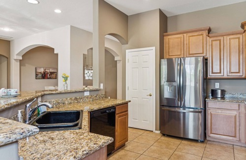 Entra en la sala familiar y siéntete como en casa. Con un lujoso sofá seccional, una silla tipo club estampada y una mesa de centro de madera oscura, este acogedor espacio puede acomodar hasta siete personas y es un gran lugar para relajarse después de un largo viaje. Relájate y siente el calor de la chimenea en las noches frescas del desierto. Siéntase libre de poner una película en el reproductor de DVD o ver un buen programa en el televisor de pantalla plana grande. Los nichos de medios integrados albergan una decoración elegante y muchos DVD para que los disfrute durante su estadía.