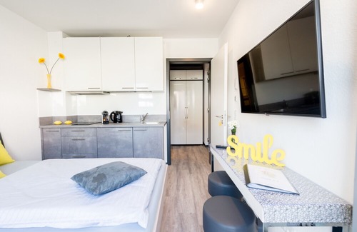Modern single room apartment with comfort equipment for 1-2 people in a small, charming aparthotel (without breakfast). The chic interior will inspire you. With its own mini kitchen for your individual breakfast. Nespresso machine and coffee for free. Bakery and supermarket around the corner.
